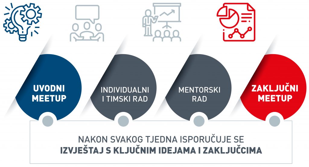 ONLINE (putem Microsoft teams platforme) kroz 5 modula, a svaki modul obuhvaća 2 MeetUpa te individualni, grupni i mentorski rad.